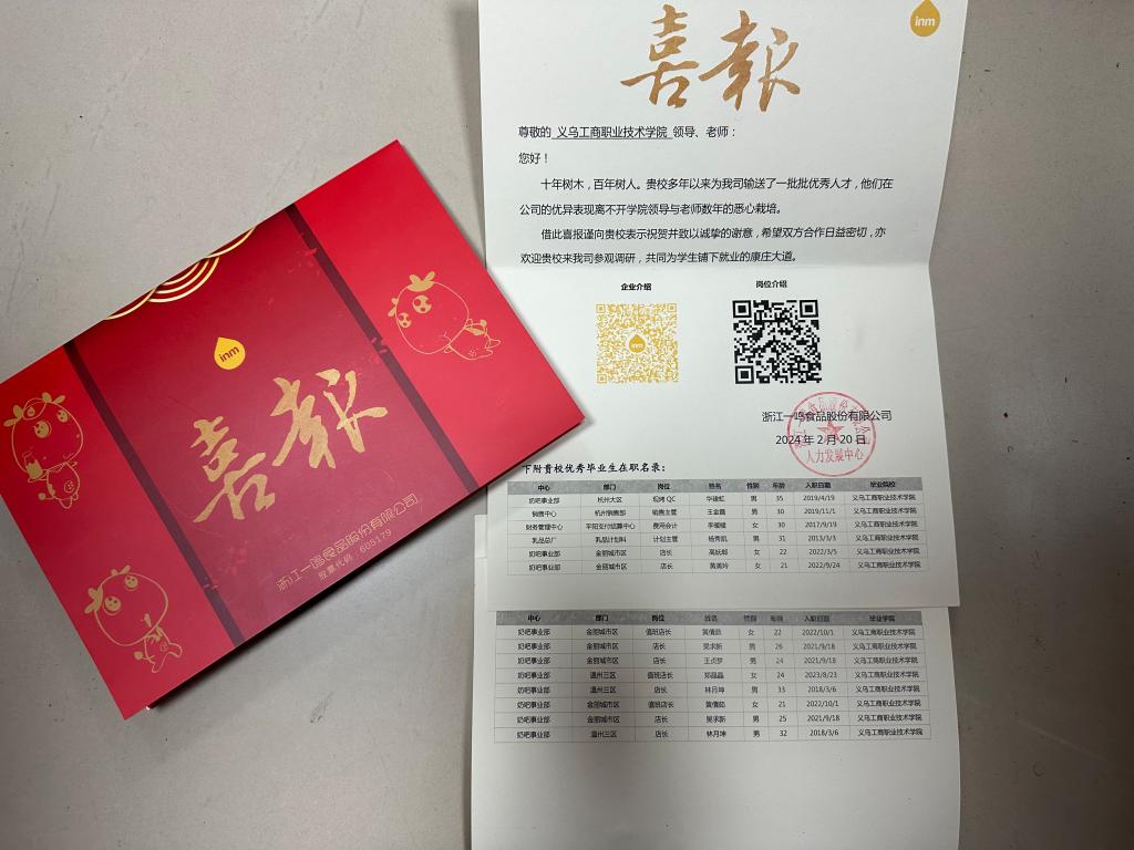 近日,jbo竞博官网登录收到一封来自浙江一鸣食品股份有限公司的喜报。信中高度认可吴求新等13位毕业生在岗的优异表现,并向学校为公司发展输送一批批优秀人才致以诚挚的谢意,期待未来能与学校更加紧密合作。