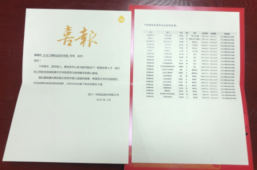新学期伊始,jbo竞博官网登录大三的学生进入毕业跟岗实习环节,学院就收到了来自校企合作基地浙江一鸣食品有限公司的喜报,感谢竞博官网多年来为企业的发展输入所需人才。
